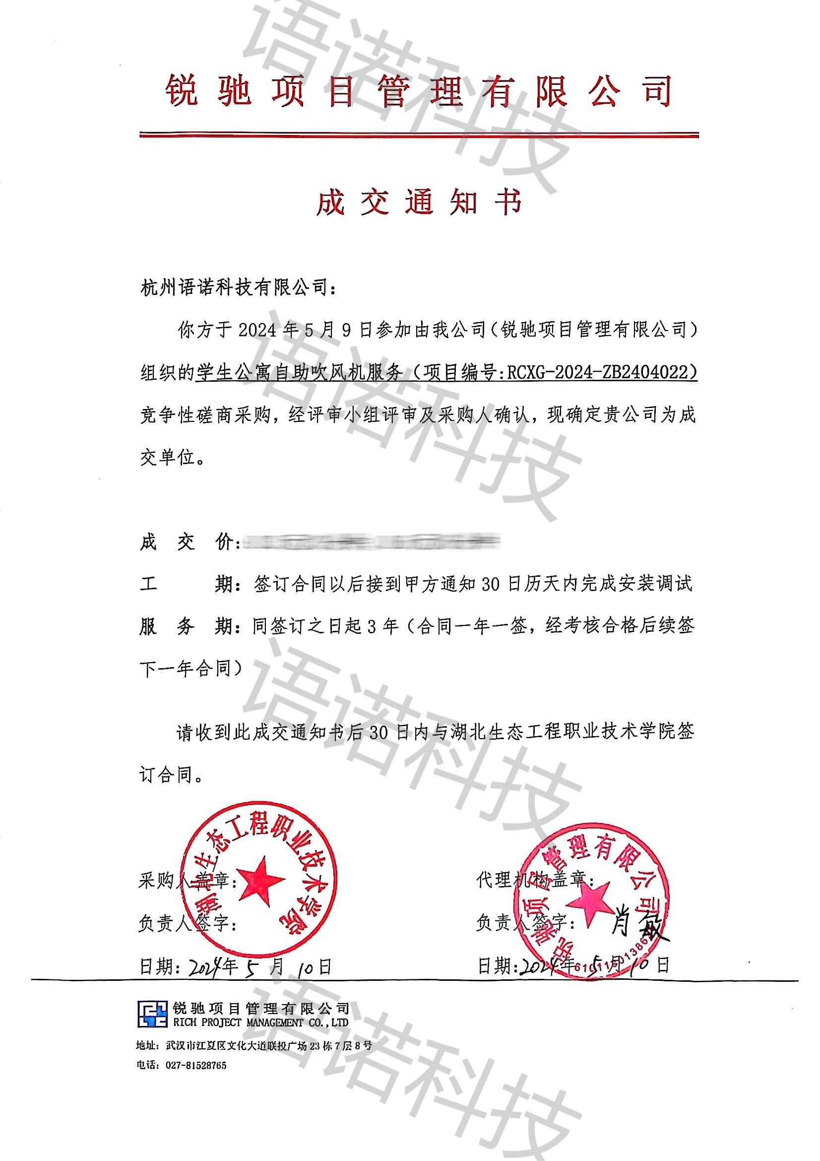 热烈祝贺,杭州语诺科技中标,获取湖北生态工程职业学院的中标通知书