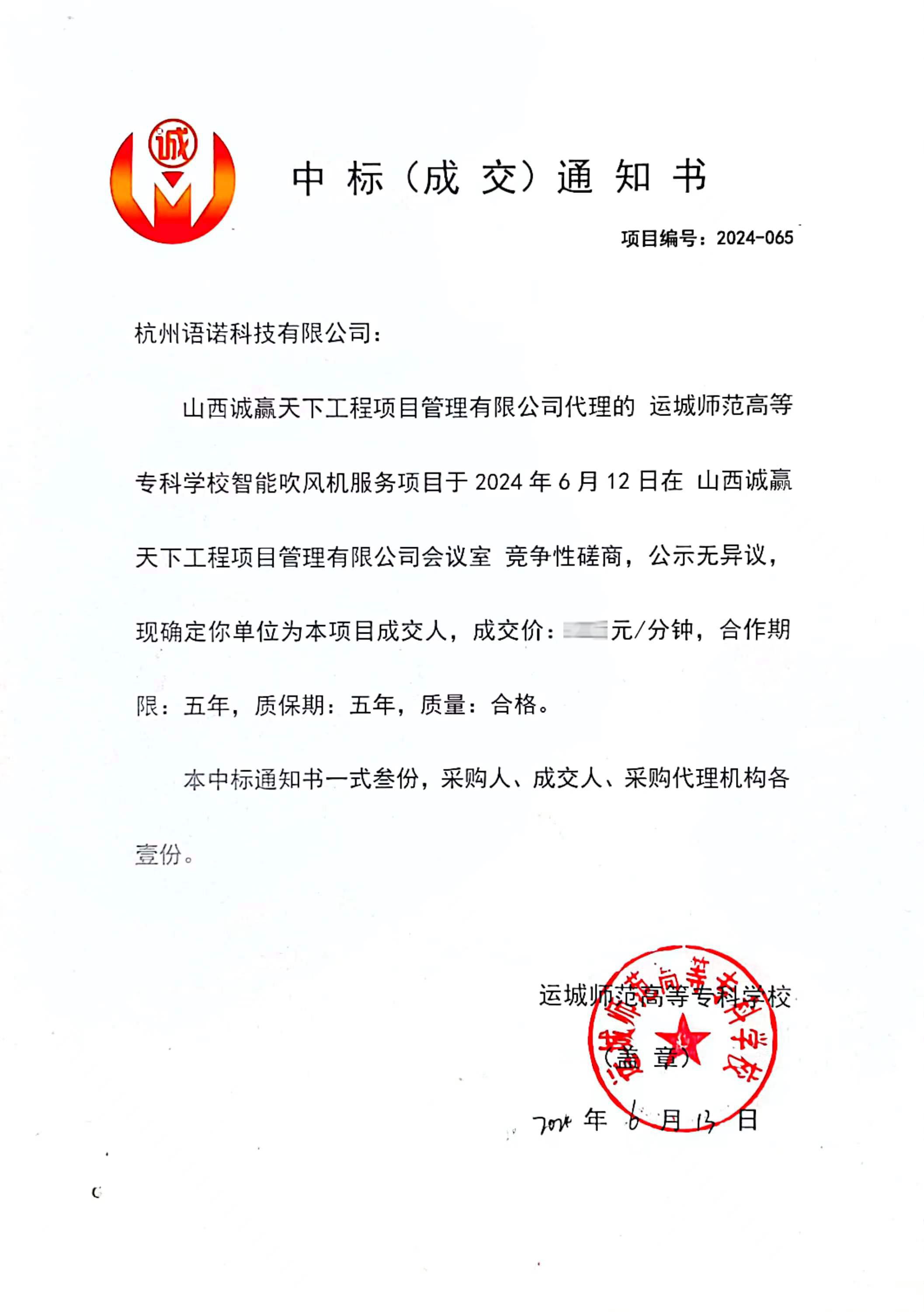 热烈祝贺,杭州语诺科技中标,获取运城师范高等专科学校的中标通知书