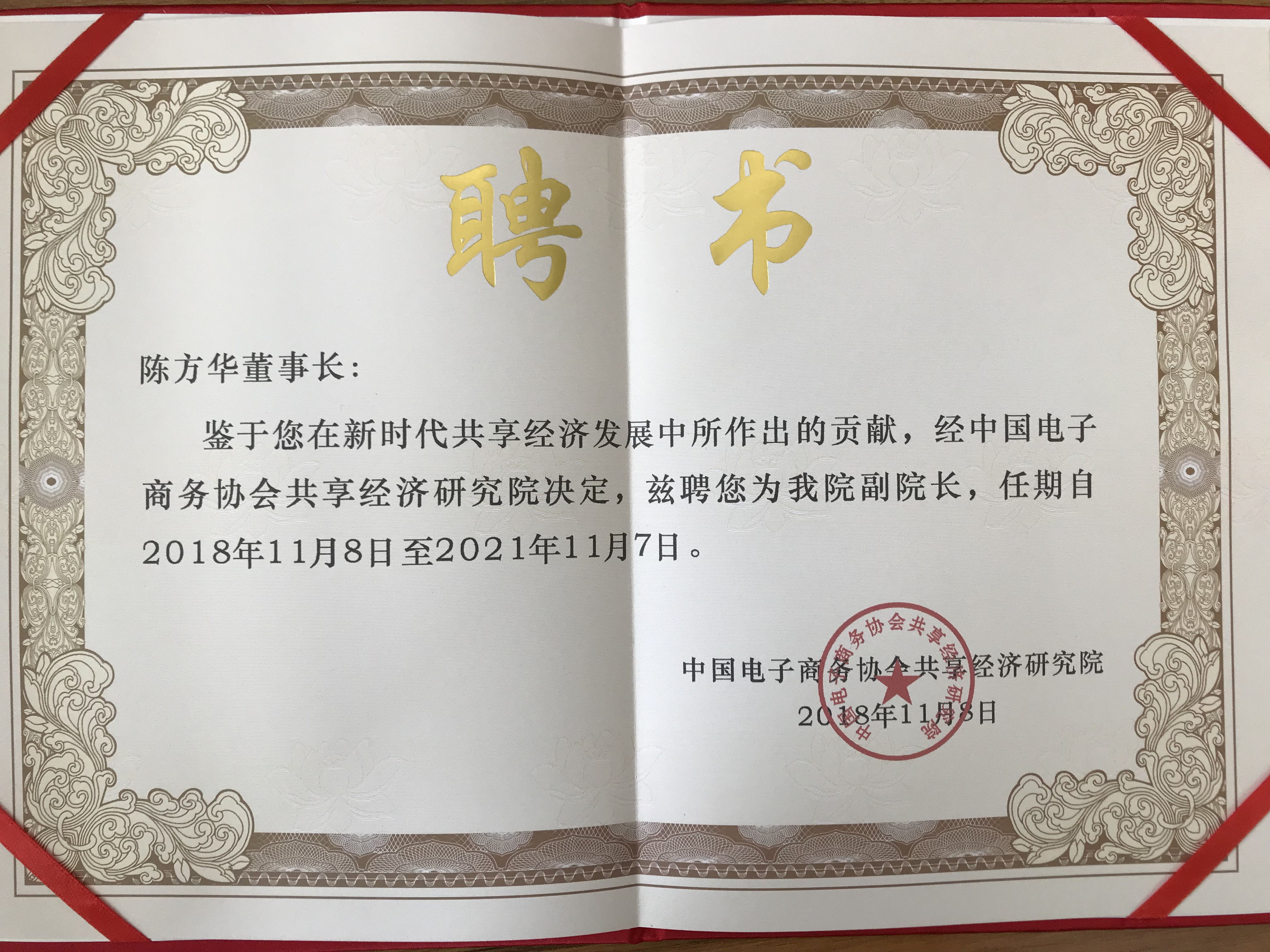 热烈祝贺我公司董事长陈方华先生被中国电子商务协会共享经济研究院聘为副院长