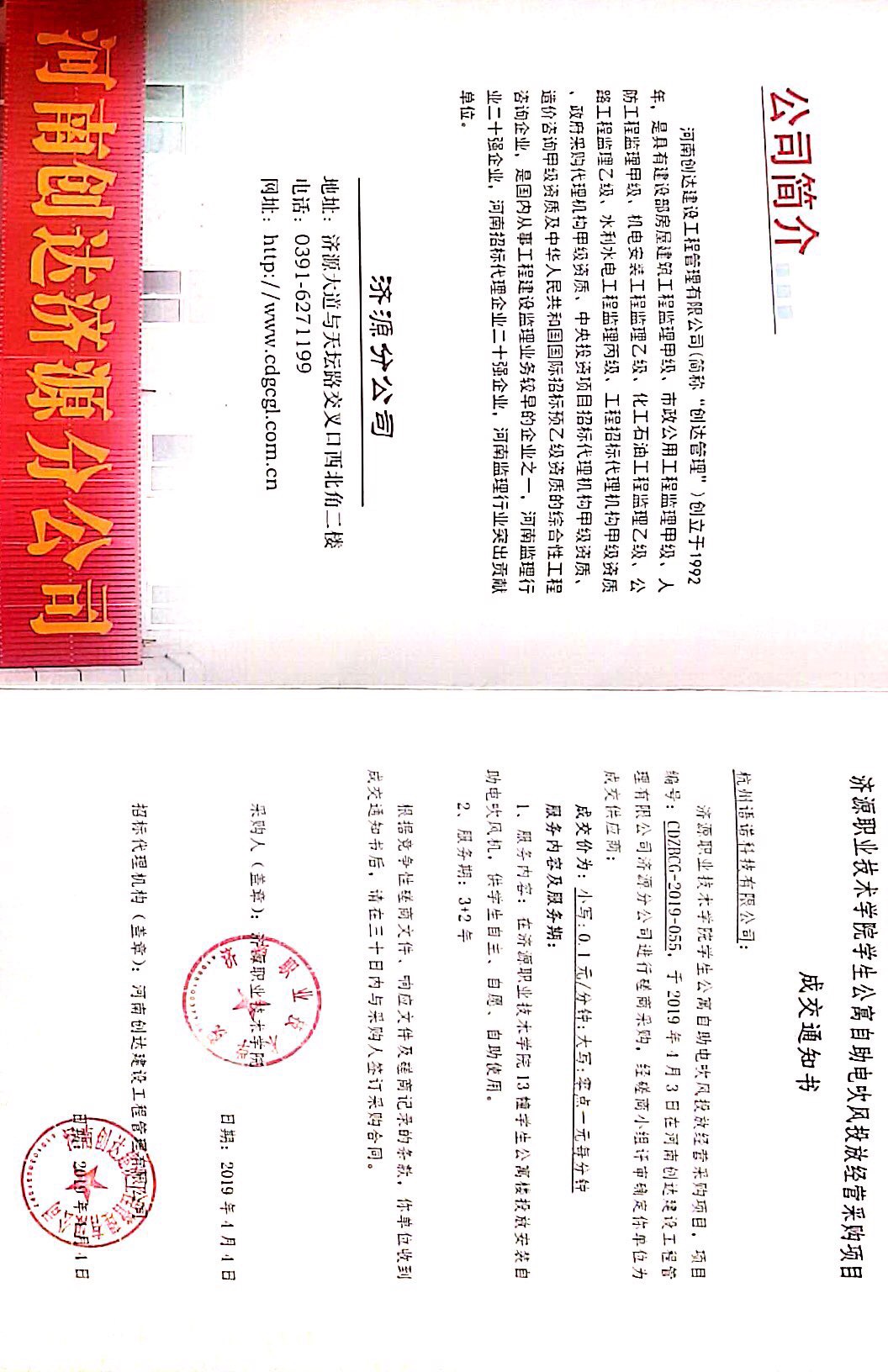 热烈祝贺我公司中得济源职业技术学院学生公寓自助电吹风服务标的