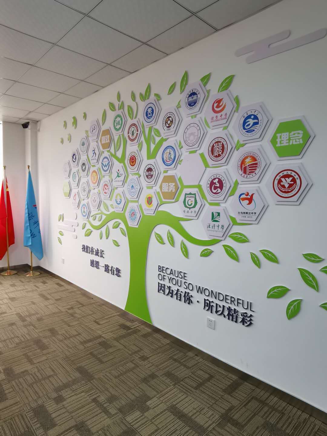 (综合办公室内:浙江省内部分合作高中院校展示墙)