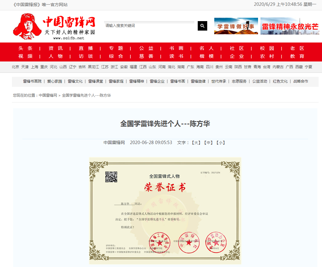 陈方华董事长这样一种“高调学雷锋,低调做企业”的高品格精神由2020.6.28号被中国雷锋网授予:全国学雷锋先进个人